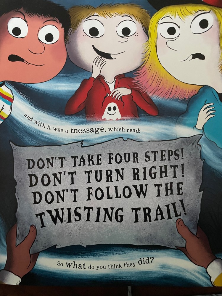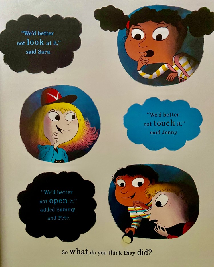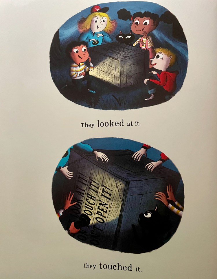 “Patschke and Garrigue amusingly exploit the allure of don’t for kids in this picture book—and what better day to do so than on Halloween? Sammy, Jenny, Sara, and Pete succumb to temptation when they stumble upon a box labeled “DON’T LOOK AT IT! DON’T TOUCH IT! DON’T OPEN IT!” Ignoring the exhortation kicks off an adventure fraught with eerie atmosphere and further irresistible warnings (“So what did the friends do?” becomes the story’s refrain). The messages eventually lead the group into “a spooky old house” where, one by one, they vanish, leaving only Sara in front of an ominous cellar door… with a surprise on the other side. Digital illustrations playfully evoke classic horror elements—ominous uplighting of faces, big shadows, eerie mists—in this likably tense tale. Characters are portrayed with various abilities and skin tones. Ages 3–7.” (July) PUBLISHERS WEEKLY